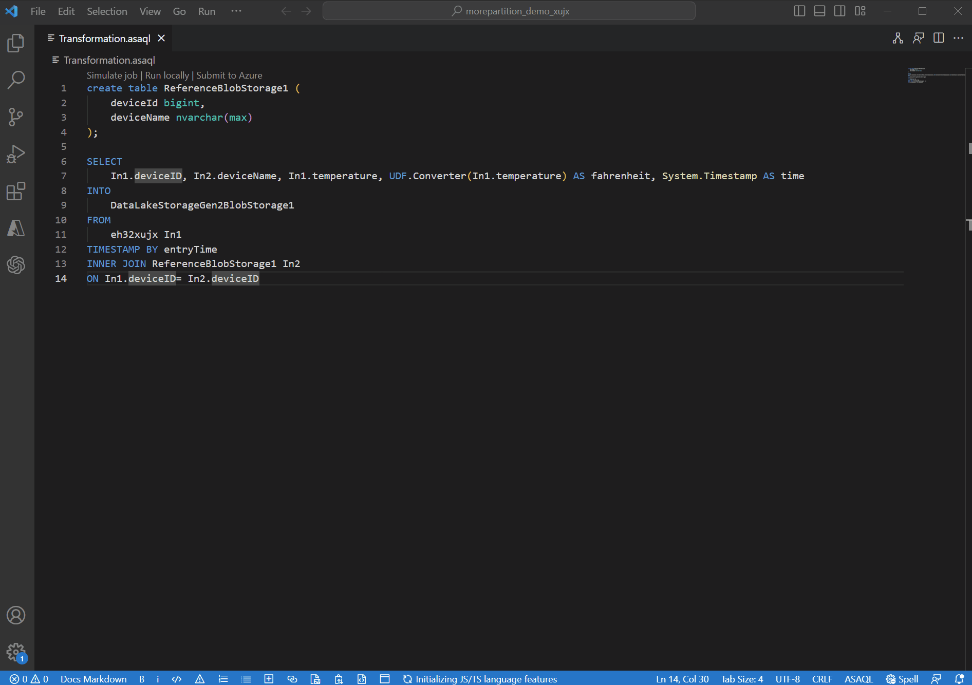 VS Code で ASA プロジェクトを開きます。 クエリ ファイル *.asaql に移動し、[Simulate job](ジョブのシミュレート) を選択してジョブ シミュレーションを開始します。