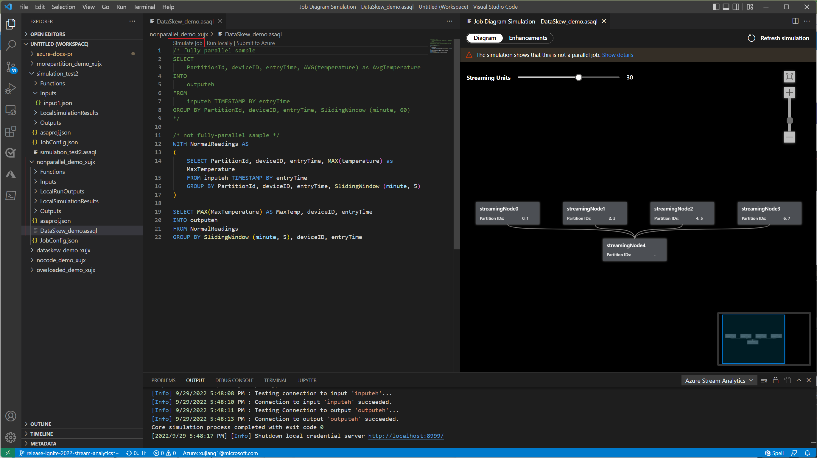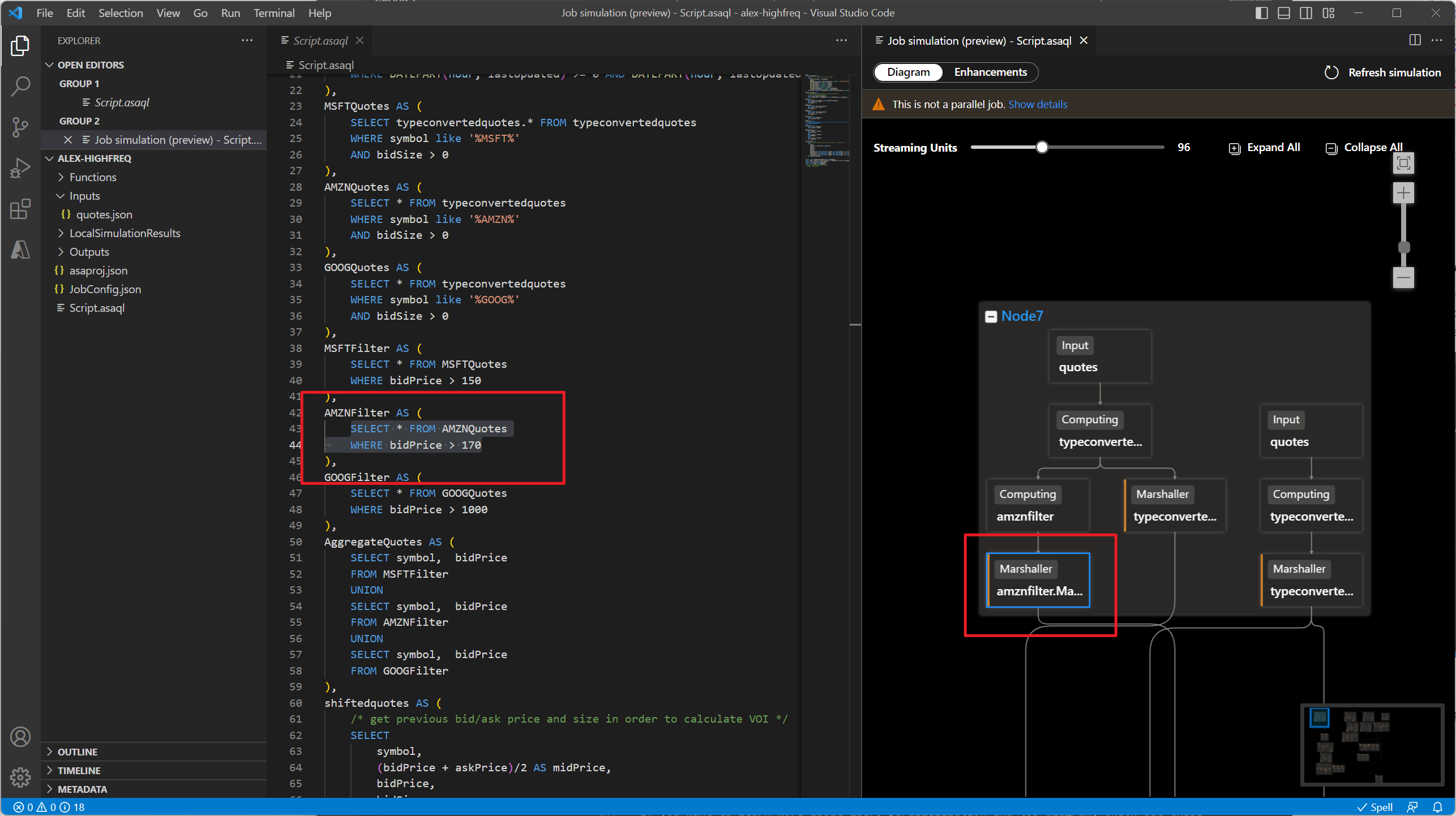 Azure Stream Analytics (ASA) ジョブのパフォーマンスを向上させる方法の 1 つが、クエリに並列処理を適用することです。 この記事では、Azure portal と Visual Studio Code (VS Code) のジョブ シミュレーションを使用して、Stream Analytics ジョブに対するクエリの並列処理を評価する方法について説明します。 さまざまな数のストリーミング ユニットについて、クエリの実行を視覚化し、編集候補に基づいてクエリの並列処理を改善する方法について説明します。