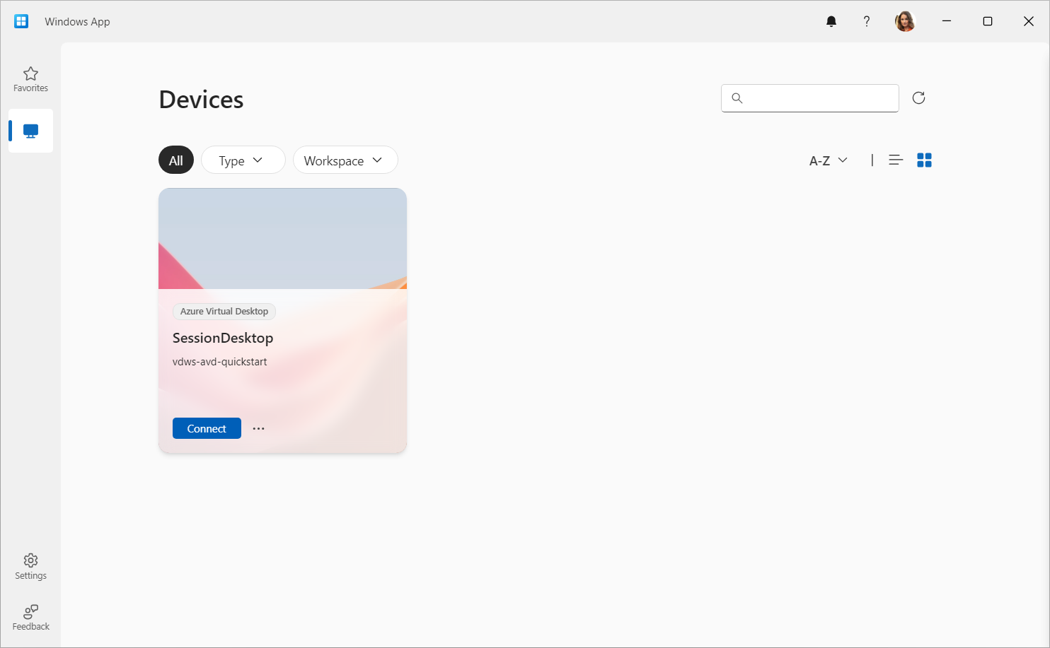 サンプルの Azure Virtual Desktop 環境がデプロイされたら、Windows Appを使用して接続し、デプロイ中に割り当てたユーザー アカウントでサインインできます。