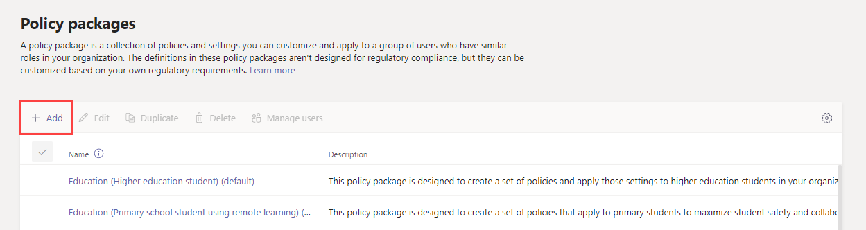 Microsoft Teams管理センターの左側のウィンドウで、[ ポリシー パッケージ] を選択し、[ 追加] をクリックします。