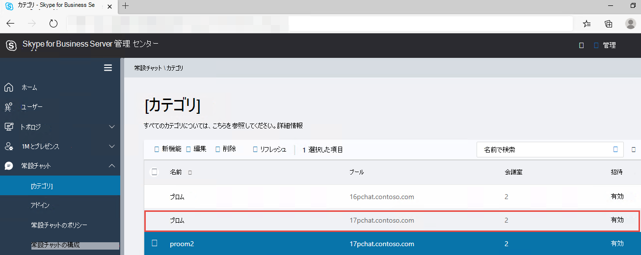 Skype for Business Server 2019 で重複するカテゴリを確認する: データベースをインポートした後、Skype for Business Server 2015 の重複するカテゴリが Skype for Business Server 2019 で作成されていることを確認します。 これは、モダン 管理 コントロール パネル (MACP) で確認できます。