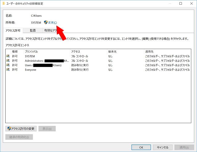 - [セキュリティ]タブをクリックし、[詳細設定]ボタンをクリックします