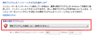 3. Windows Updateの画面、左ペインに[ 設定の変更 ]がありますので、それをクリック[重要な更新プログラム]の選択肢を**「更新プログラムを確認しない(推奨されません)」に変更(下図)