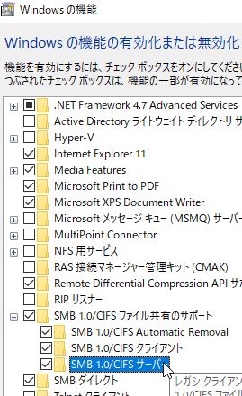 Windows10側のSMBv1.0/CIFSを追加して下さい。