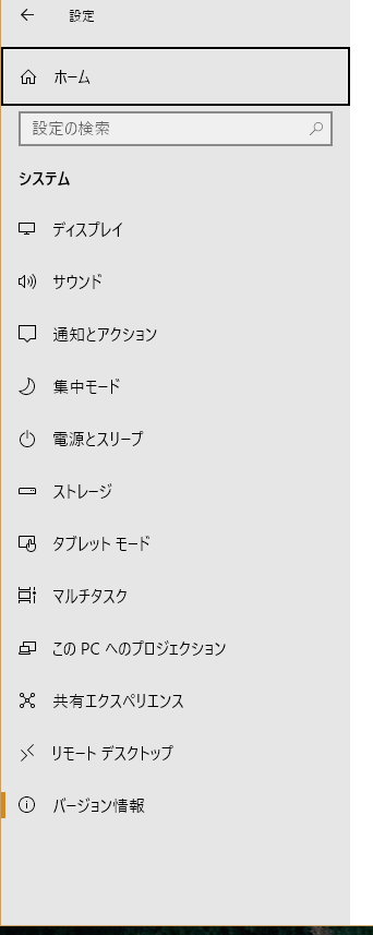 (「バージョン情報」を選択したが、黒枠が勝手に上に移動し、一番上の「ホーム」に固定される)