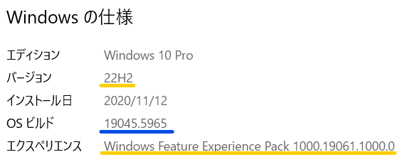 | 22H2 | 22H2(マイナー) 最終バージョン | 19045.2130 | 2022年10月18日 | 2025年10月15日 | Windows 10の最終バージョン |