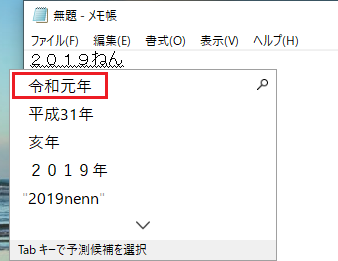 日本の新元号対応の更新プログラムは適用されているのであれば、IMEで「2019ねん」と入力すると候補に「令和元年」が表示されませんでしょうか。