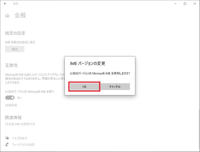 - IME バージョン変更ダイアログの「OK」を選択する