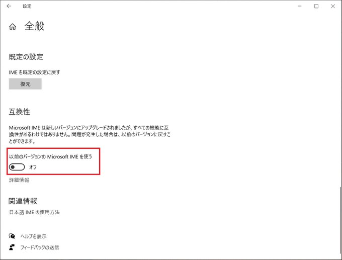 - 一番下までスクロールし、互換性から「以前のバージョンの Microsoft IMEを使う」を「オン」にする