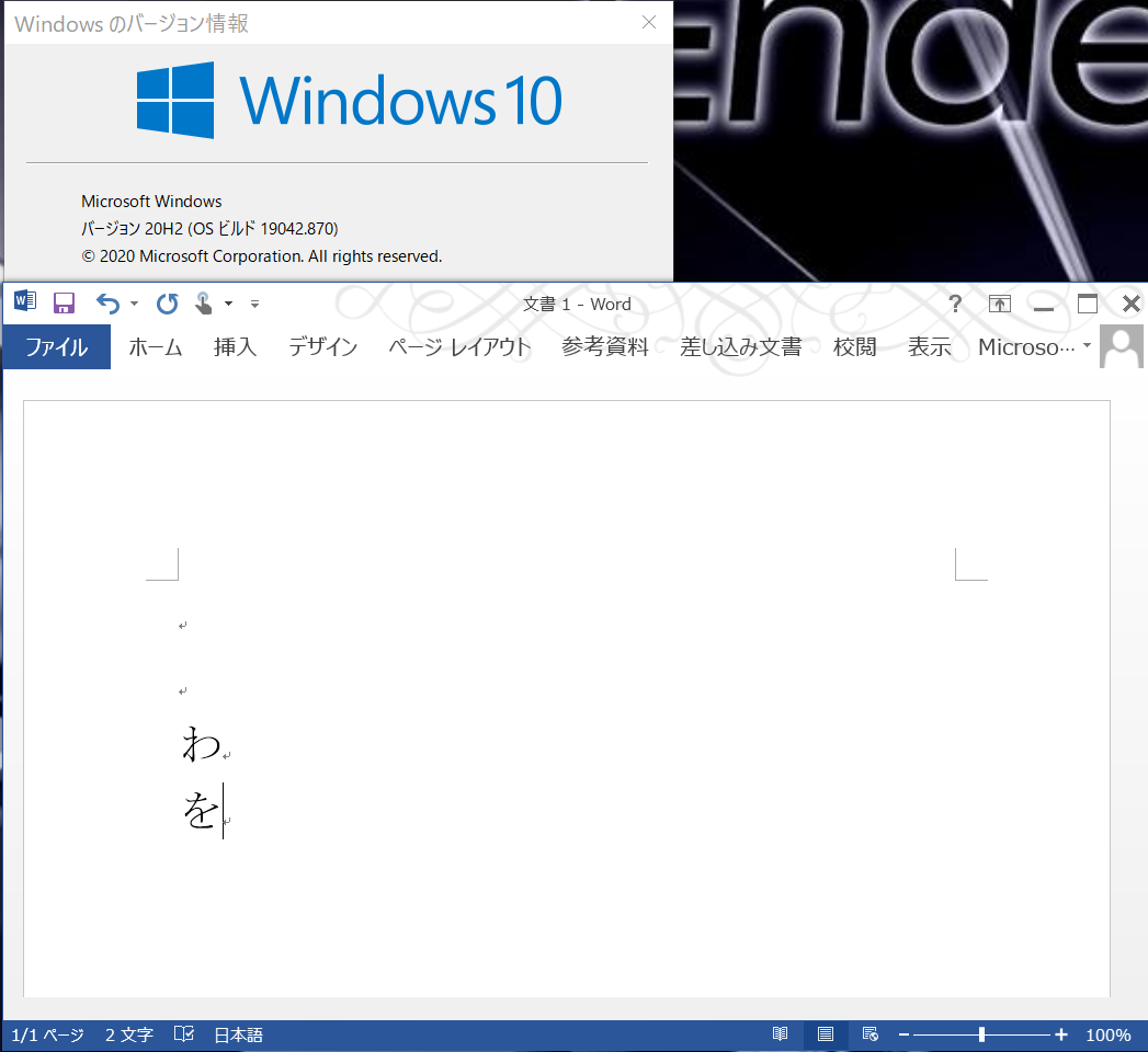 2021-03-19T09:59:26+00:00 確かに20H2のLenovoで新しいMicrosoft IMEを使い、かな入力をオンにしたところ全角キー直後の「を」は入力できませんでした。他の文字を入力した後だと何事もなかったかのように表示します。