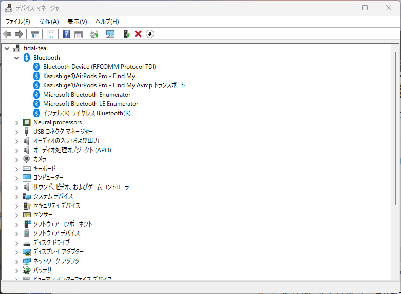 まず、デバイスマネージャーでBluetoothのアイコンの左側の > をクリックしてBluetoothコンポーネントを展開してみてください。