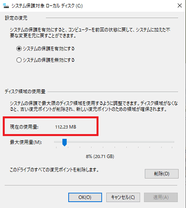 現在の使用量(下図)を確認してから手動で復元ポイントを作成した後の容量を確認すれば、増えた容量で1つの復元ポイントで使われる容量が分かります。