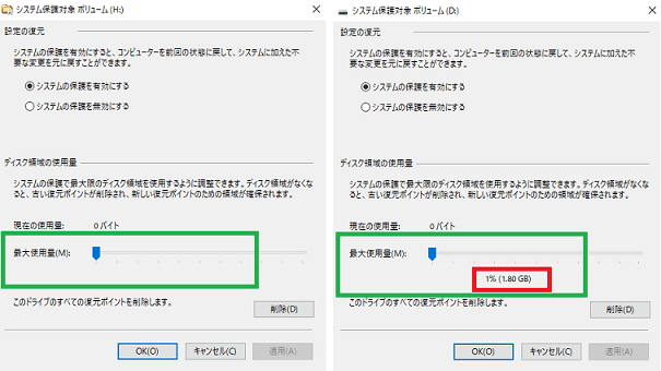 有効化しても下図左側(Hドライブ)のように最大使用量は空白で何も表示されていませんでしたが、スライドを動かすことで最大使用量が表示され、その後はスライドを最小化しても無効化しても下図右側(Dドライブ)のように1%となりゼロ(空白)に戻すことができなくなりました。