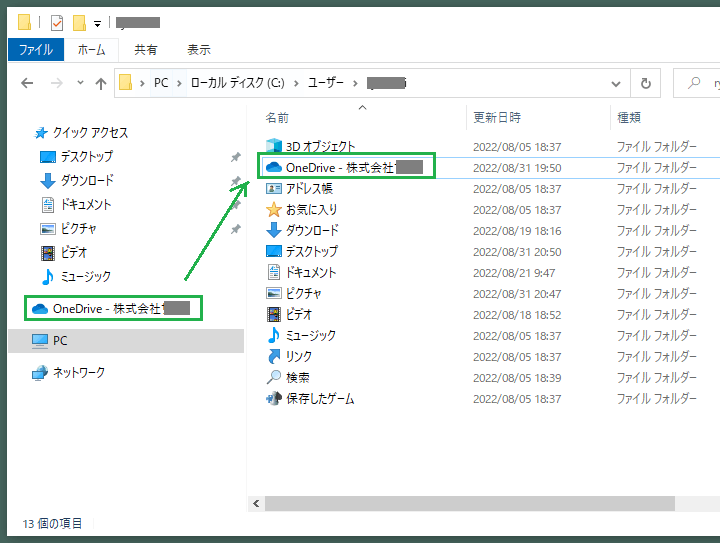 「C:\ユーザー\ユーザー名」からOneDrive フォルダ が削除されました。