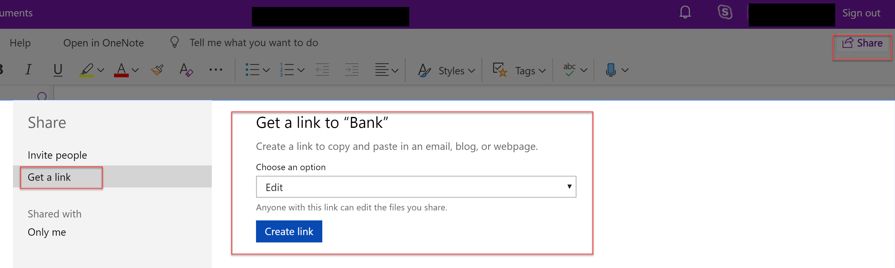 OneNote Online で Share > Get a Link