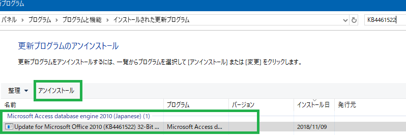 最初に紹介した別スレッドと重複しますけど、下のようにインストールされた更新プログラムの中にKB4461522が独立して存在する場合は簡単に削除できそうですが、