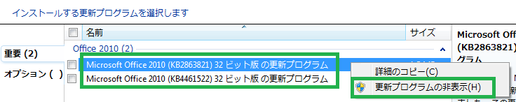 Windowsアップデートの更新プログラム再度確認後、もし、KB4461522 と KB2863821 が見つかったら、更新プログラムをインストールする前にそれぞれを選んで右クリックから「更新プログラムの非表示」と進んで、インストールをブロックしてしまいましょう。