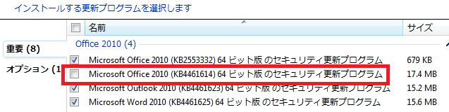 Windows 7 (Office 2010は64bit版の方を使っています)の環境ですが、更新プログラムを確認したらOffice 2010関係で4ファイルが配信されていますが、【KB4461614】はチェックが外れていて自動更新の対象にはなっていませんでした(下図)。