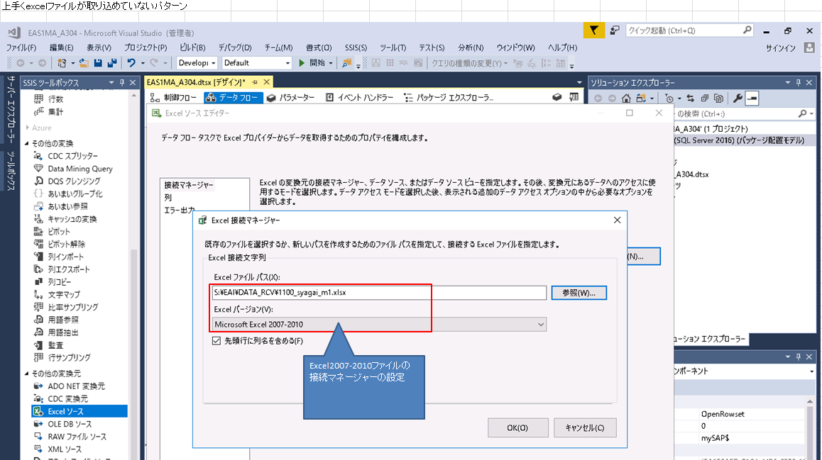 現在、「excelソース」タスクにてExcelをSSISに取込む際にエラーが起きています。excel97-2003は取込