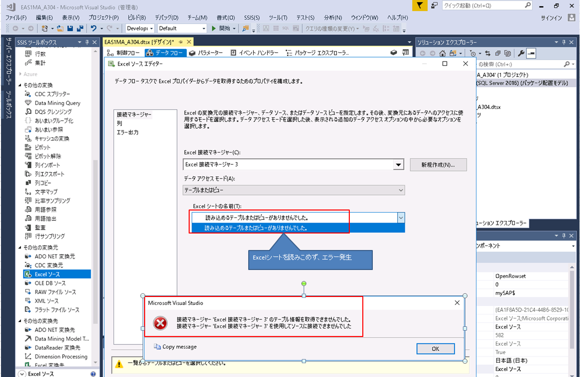 windows2016サーバーにてSSISでExcelを取込み、編集処理を行うソリューションを作成しています。