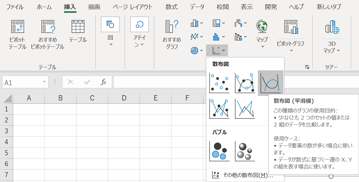 ⑤手順③で入力したtの値及び手順④で算出したvの値を使用して散布図でグラフを描きます.