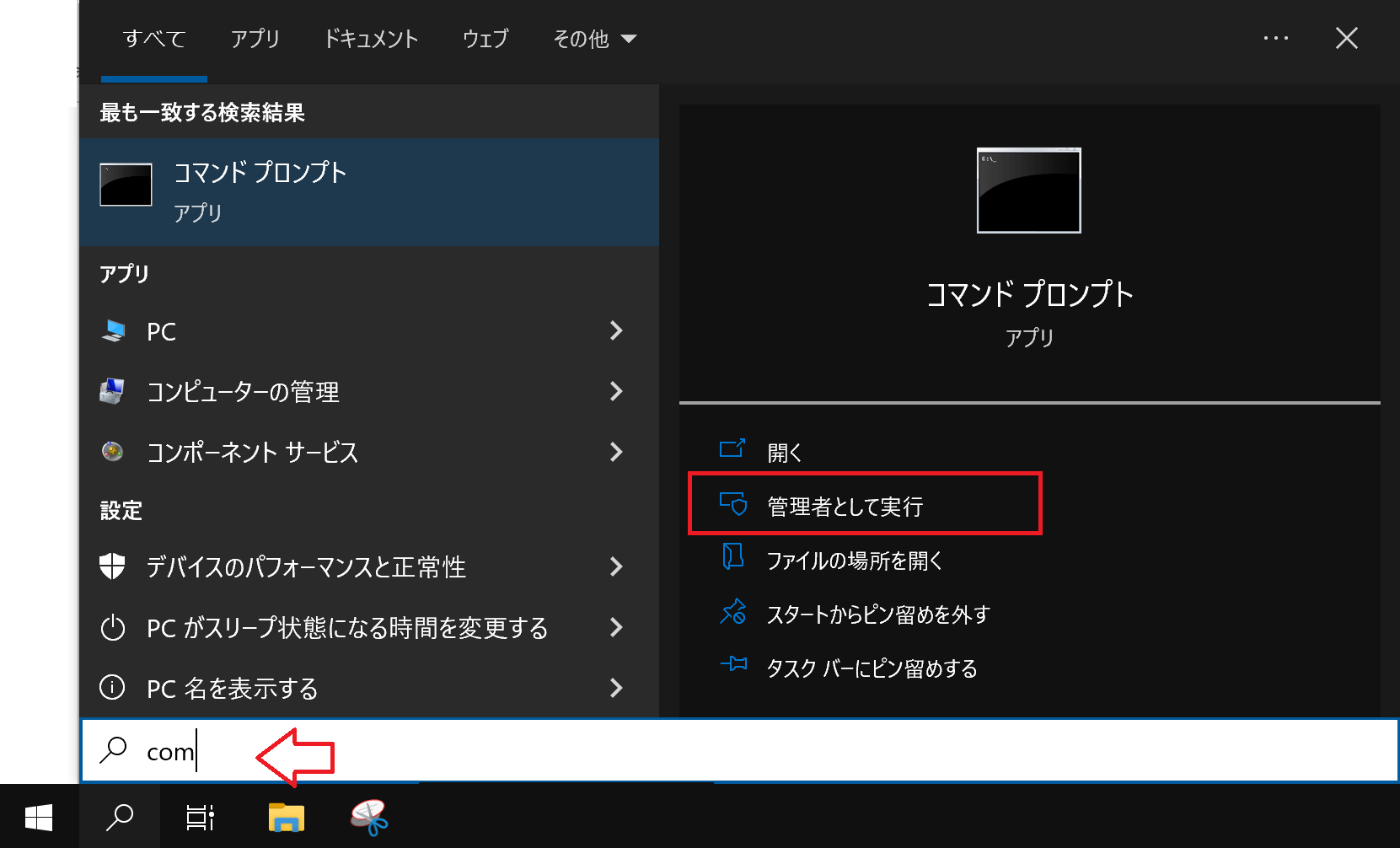 画面左下の検索ボックスに「com」と入力してコマンドプロンプトを「管理者として実行」で起動します。
