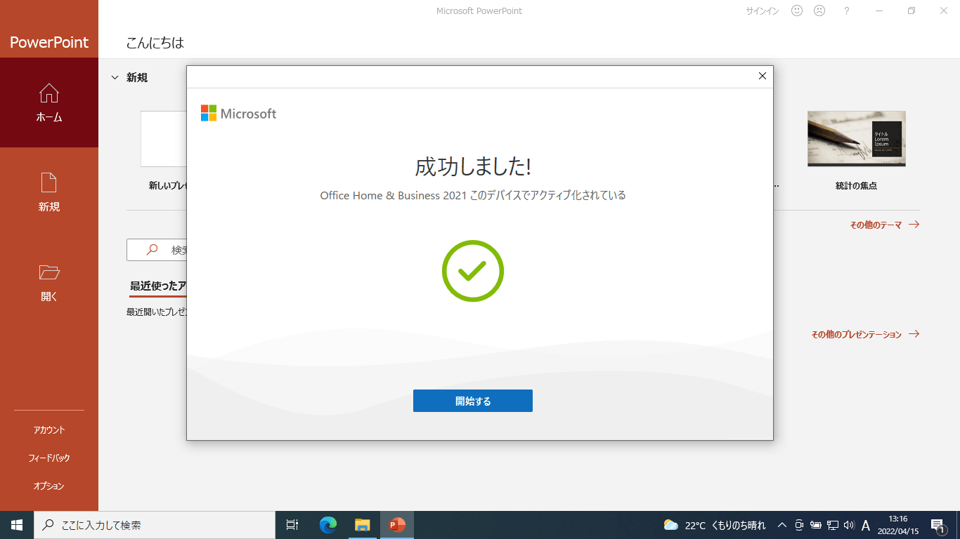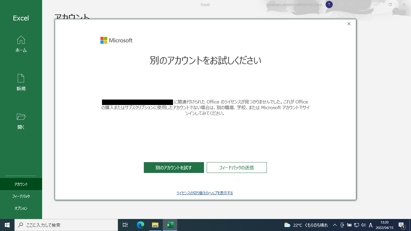 「成功しました」の画面が出ましたが、4月20日で使えなくなりますということで、officeのアカウントのところから、マイクロソフトアカウントでログインし認証しようとしましたが、「関連付けられたOfficeのライセンスが見つかりませんでした」となり、認証ができません。