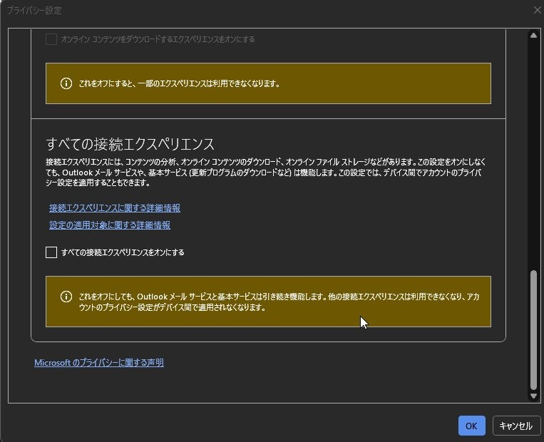 そのご セキュリティ設定の「すべての接続エクスペリエンスをオンにする」