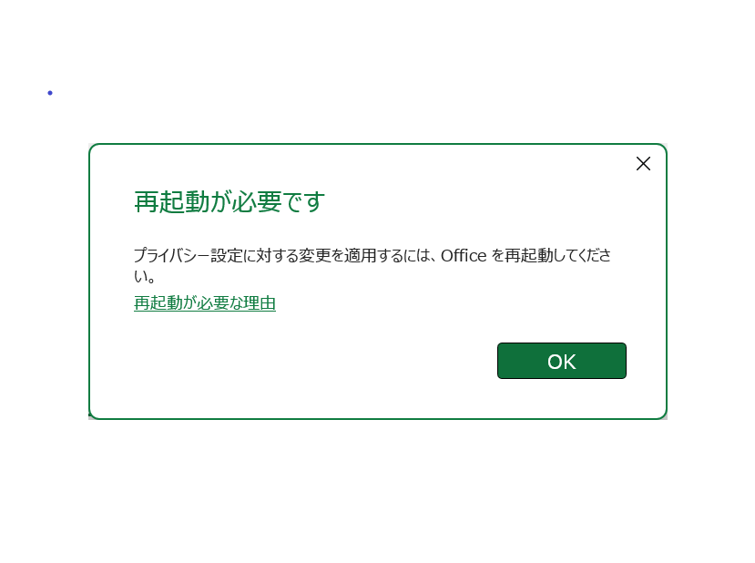 「再起動が必要です。プライバシー設定に対する変更を適用するにはofficeを再起動してください。」