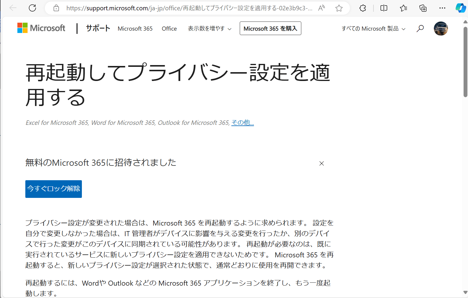 このページには「Microsoft 365 を再起動する」と書かれていますが、再起動しても繰り返し表示されます。