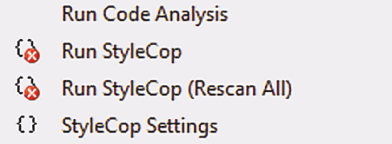 StyleCop ( stylecop.codeplex.com、英語) は、C# ソース ファイルで静的コード分析を実行するオープン ソースのツールです。このツールは Visual Studio に統合されて、コンテキスト メニューに表示され、現在のファイル、または選択したファイルやプロジェクトをスキャンするオプションを提供します。図 1 は、Visual Studio プロジェクトのコンテキスト メニューから使用できる StyleCop オプションを示しています。