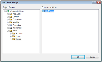 [追加] ボタンをクリックすると、ビュー コンテンツ ページに関連付けるビュー マスター ページを選択する新しいダイアログが表示されます (図 4 を参照)。 前のセクションで作成した Site.master ビュー マスター ページに移動できます。