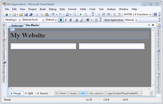リスト 1 のビュー マスター ページの本文には、2 つの列に対応する 2 つの <div> タグが含まれています。 カスケード スタイル シートの列クラスは、<div> タグの両方に適用されます。 このクラスは、マスター ページの上部で宣言されているスタイル シートで定義されます。 デザイン ビューに切り替えることで、ビュー マスター ページのレンダリング方法をプレビューできます。 ソース コード エディターの左下にある [デザイン] タブをクリックします (図 2 を参照)。