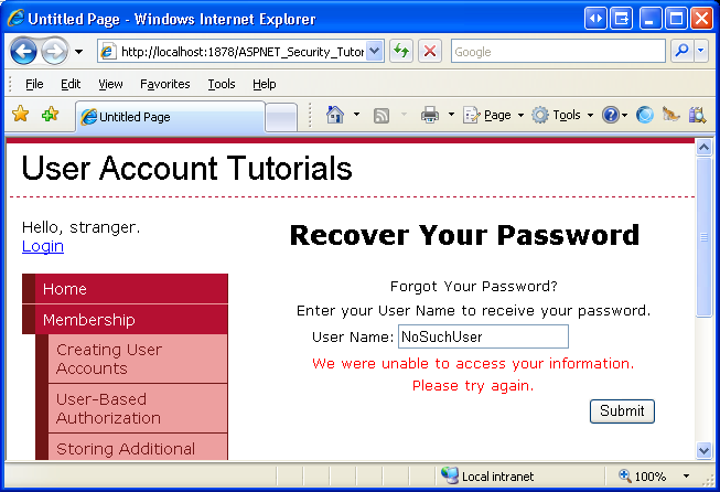 SMTP 設定を構成したら、ブラウザーから RecoverPassword.aspx ページにアクセスします。 まず、ユーザー ストアに存在しないユーザー名を入力してみてください。 図 2 に示すように、PasswordRecovery コントロールには、ユーザー情報にアクセスできなかったことを示すメッセージが表示されます。 メッセージのテキストは、コントロールの UserNameFailureText プロパティを使用してカスタマイズできます。