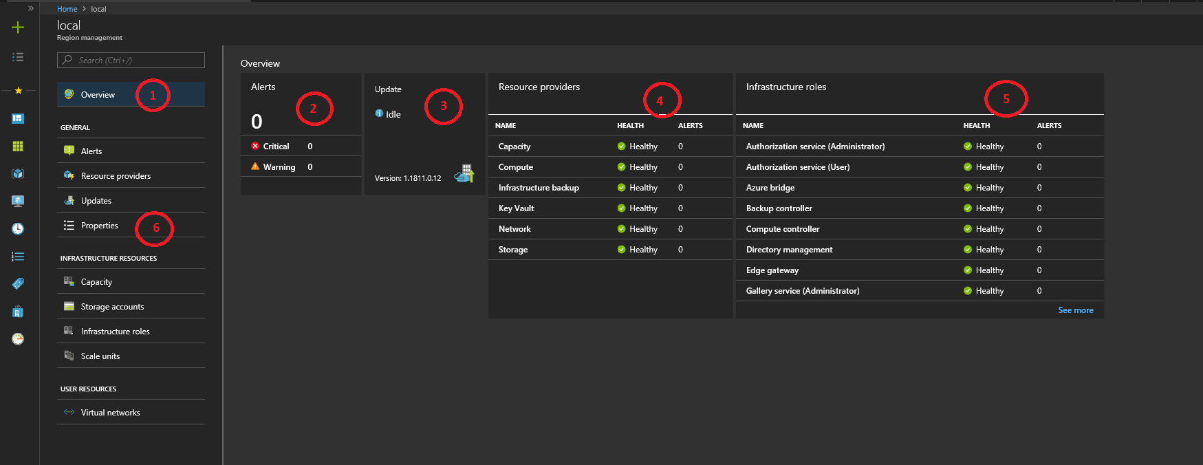 Azure Stack Hub には、リージョン管理 タイルで使用できる一連のリージョン管理機能があります。 このタイルは、管理者ポータルの既定のダッシュボードで Azure Stack Hub オペレーターが使用できます。 この画面では、Azure Stack Hub リージョンとそのコンポーネント (リージョン固有) を監視および更新できます。