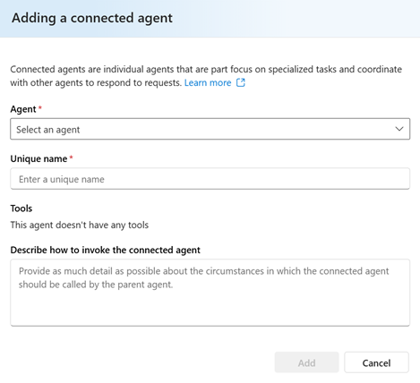 - ドロップダウンから 既存のエージェント を選択します。 これは、メイン エージェントがタスクを委任する接続されたエージェントです。