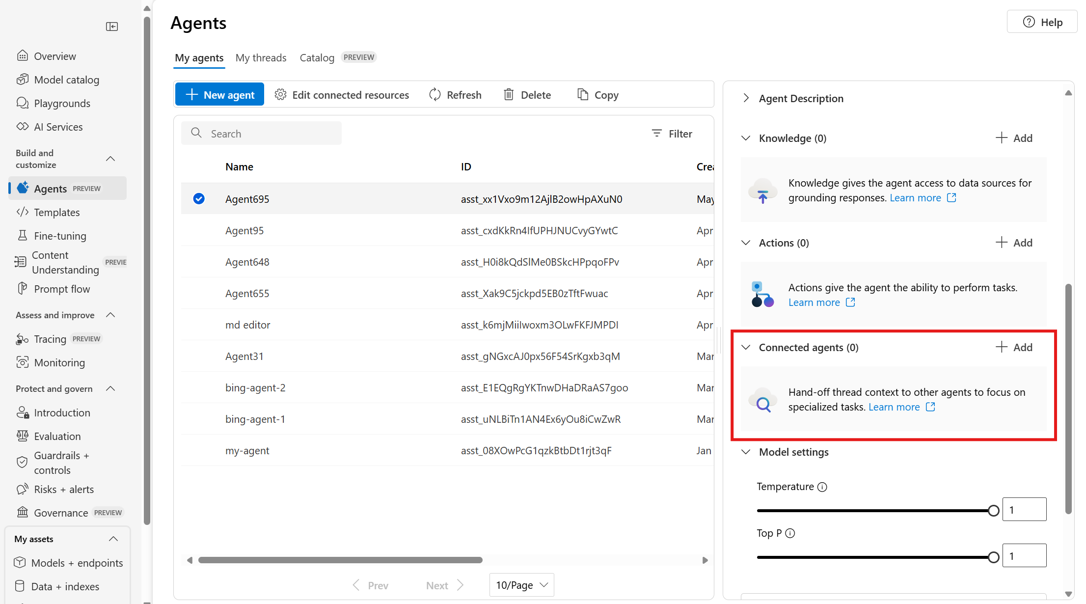 stock_price_agent = project_client.agents.create_agent( model=os.environ["MODEL_DEPLOYMENT_NAME"], name="stock_price_bot", instructions="Your job is to get the stock price of a company. If you don't know the realtime stock price, return the last known stock price.", #tools=... # tools to help the agent get stock prices )エージェント ID、名前、および説明を使用して、接続されたエージェント ツールを初期化します