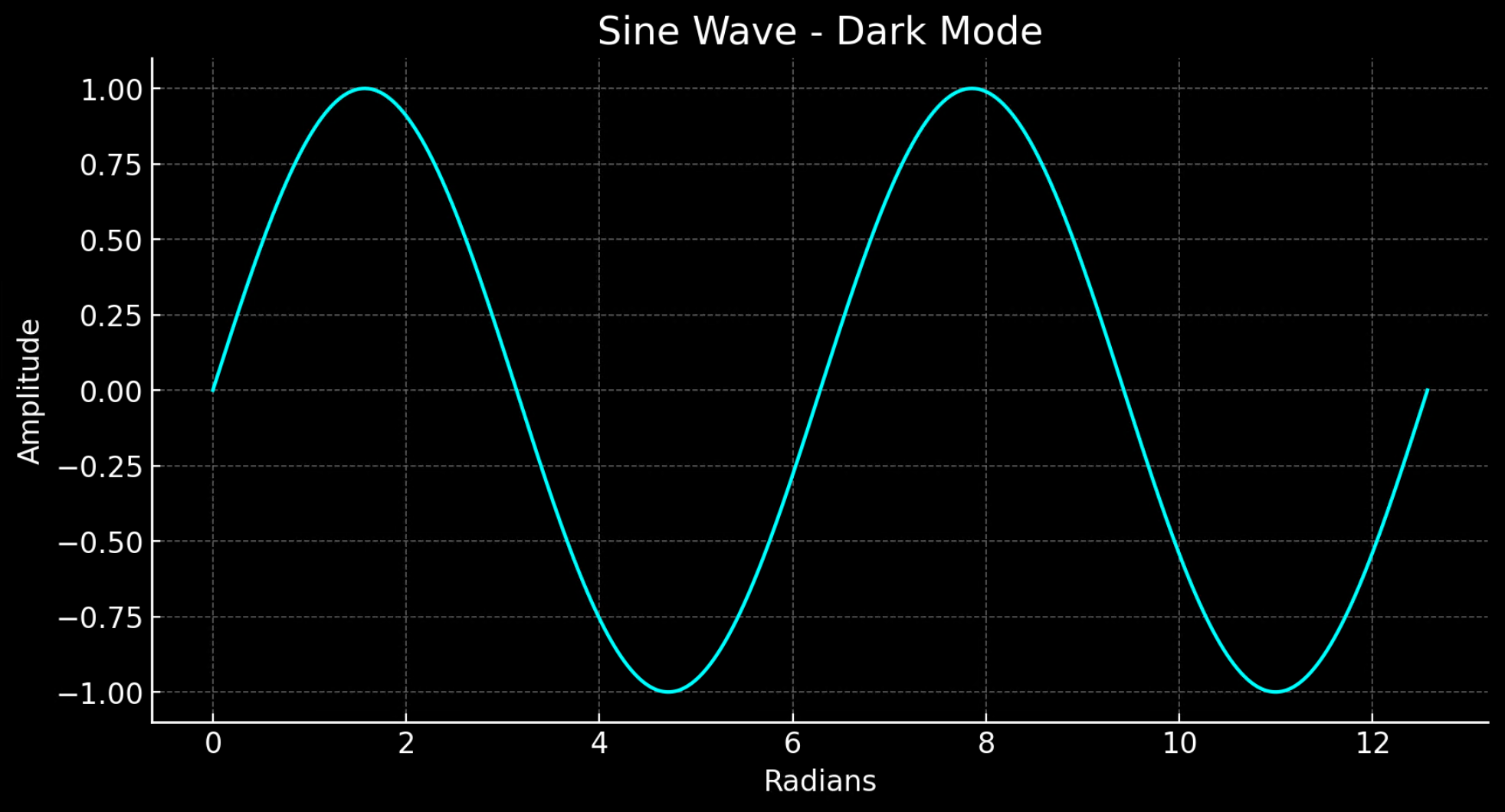 "value": "Here is the dark mode version of the sine wave visualization. I've used the 'dark_background' style in Matplotlib and chosen a cyan color for the plot line to ensure it stands out against the dark background."