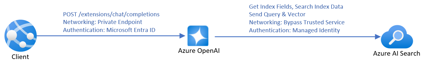 推論要求で埋め込みの依存関係が指定された場合、Azure OpenAI は書き換えられたクエリをベクトル化し、クエリとベクターの両方がベクトル検索のために Azure AI 検索に送信されます。