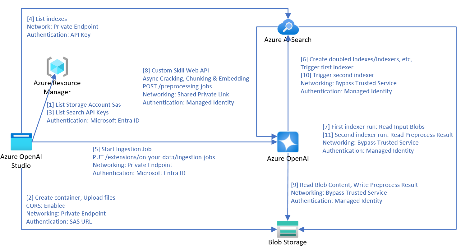 データに対して Azure OpenAI を使用して、Azure Blob Storage、ローカル ファイル、または URL から Azure AI 検索にデータを取り込む場合、データを処理するために次のプロセスが使用されます。