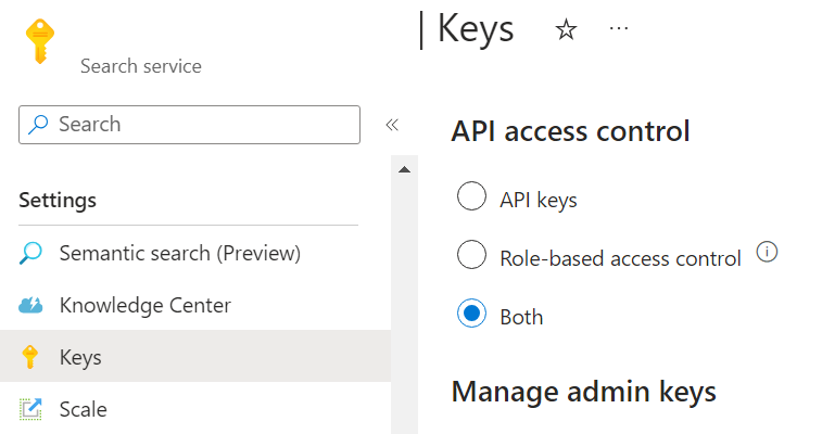Azure OpenAI ではマネージド ID を使用して Azure AI 検索にアクセスするため、お使いの Azure AI 検索でロールベースのアクセス制御を有効にする必要があります。 Azure portal でこれを行うには、Azure portal の [キー] タブで [両方] または [ロールベースのアクセス制御] を選択します。