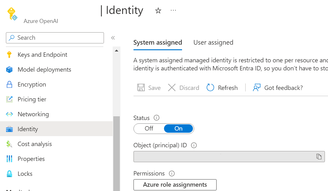 Azure AI Search とストレージ アカウントが Microsoft Entra ID 認証を介して Foundry Models で Azure OpenAI を認識できるようにするには、Foundry Models で Azure OpenAI のマネージド ID を割り当てる必要があります。 Azure portal でシステム割り当てマネージド ID をオンに切り替えるのが最も簡単な方法です。