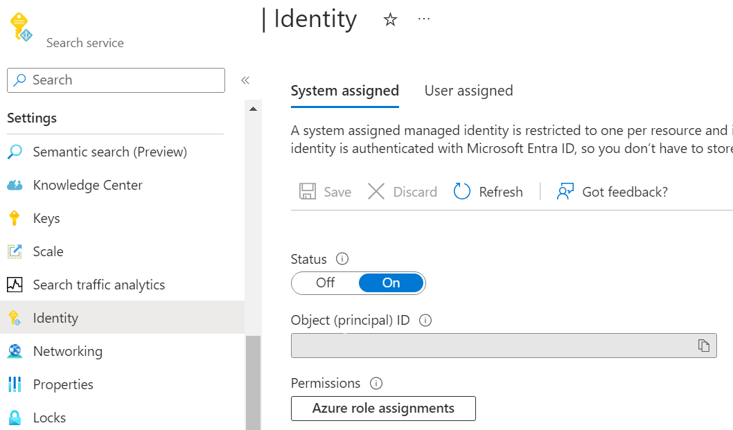 Microsoft Entra ID 認証を使用して他のリソースが Azure AI 検索を認識できるようにするには、Azure AI 検索にマネージド ID を割り当てる必要があります。 Azure portal でシステム割り当てマネージド ID をオンに切り替えるのが最も簡単な方法です。