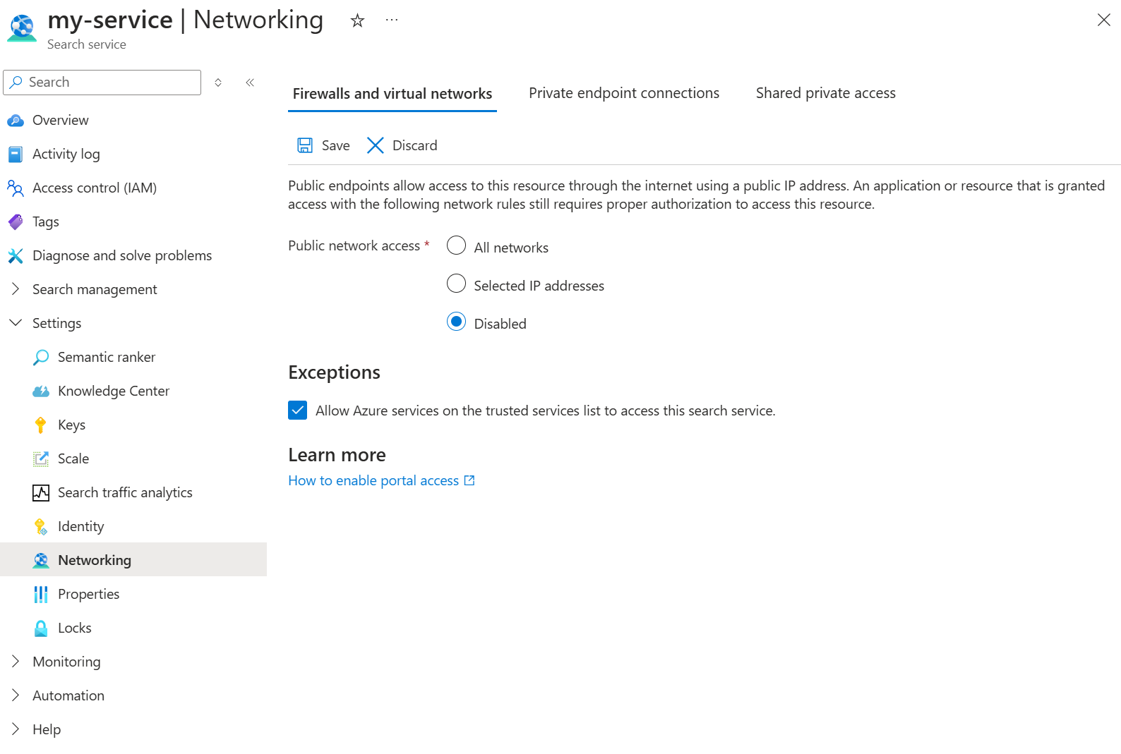 検索リソースの [ネットワーク] タブに移動します。パブリック ネットワーク アクセスが無効に設定されている場合、[信頼されたサービス リストにある Azure サービスに対し、この検索サービスにアクセスすることを許可します] を選択します。