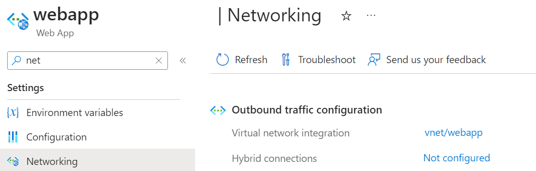Web アプリがデプロイされたら、Azure portal の [ネットワーク] タブで、Web アプリの送信トラフィック仮想ネットワーク統合を構成し、Web アプリ用に予約した 3 番目のサブネットを選びます。
