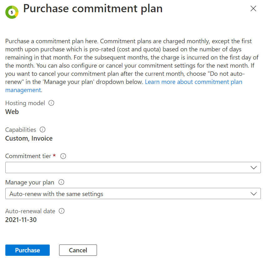 コミットメント プランの購入を継続しない場合、リソースの自動更新を [自動更新しない] に設定することができます。 コミットメント プランは、表示されたコミットメントの終了日に期限切れになります。 この日以降、コミットメント プランの料金は課金されません。 Azure リソースを引き続き使用して API 呼び出しを行うことができます(Standard 価格で課金されます)。 各月の最終日の午前 0 時 (UTC) までコミットメント プランを終了することができ、その場合次の月に対しては課金されません。