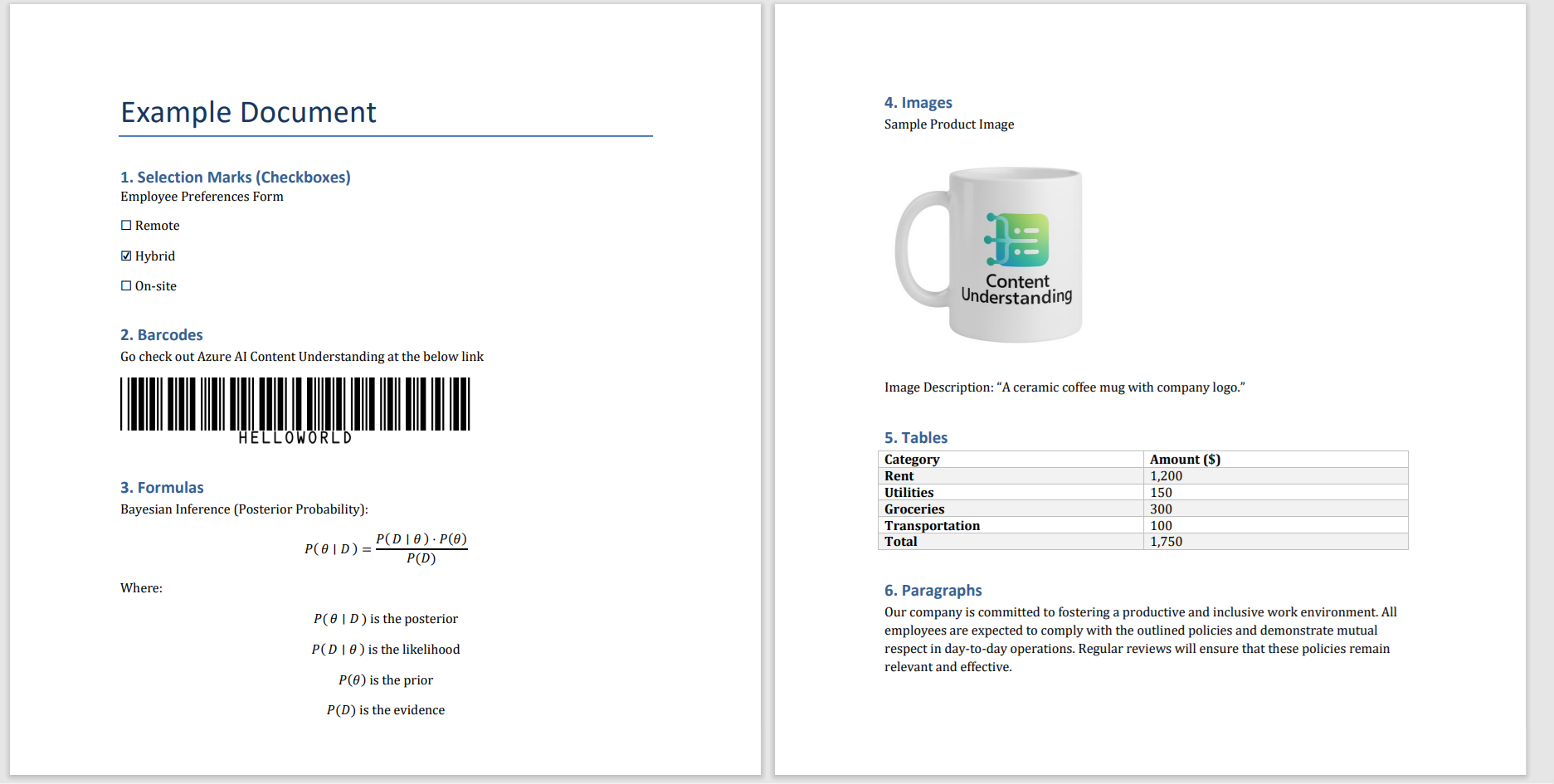 "markdown": "# Example Document\n\n\n## 1. Selection Marks (Checkboxes)\n\nEmployee Preferences Form\n☐\nRemote\n☒\nHybrid\n☐\nOn-site\n\n\n## 2. Barcodes\n\nGo check out Azure Content Understanding at the below link\n\n\n## 3. Formulas\n\nBayesian Inference (Posterior Probability):\n\n$$P \\left( \\theta \\mid D \\right) = \\frac { P \\left( D \\mid \\theta \\right) \\cdot P \\left( \\theta \\right) } { P \\left( D \\right) }$$\n\nWhere:\n\n$$P \\left( \\theta \\mid D \\right)$$\nis the posterior\n\n$P \\left( D \\mid \\theta \\right)$ is the likelihood\n$P \\left( \\theta \\right)$ is the prior\n\n$$P \\left( D \\right) i s \\quad t h e \\quad e v i d e n c e$$\n\n<!-- PageBreak -->\n\n\n## 4. Images\n\nSample Product Image\n\n\n<figure>\n\nContent\nUnderstanding\n\n</figure>\n\n\nImage Description: \"A ceramic coffee mug with company logo.\"\n\n\n## 5. Tables\n\n\n<table>\n<tr>\n<th>Category</th>\n<th>Amount ($)</th>\n</tr>\n<tr>\n<td>Rent</td>\n<td>1,200</td>\n</tr>\n<tr>\n<td>Utilities</td>\n<td>150</td>\n</tr>\n<tr>\n<td>Groceries</td>\n<td>300</td>\n</tr>\n<tr>\n<td>Transportation</td>\n<td>100</td>\n</tr>\n<tr>\n<td>Total</td>\n<td>1,750</td>\n</tr>\n</table>\n\n\n## 6. Paragraphs\n\nOur company is committed to fostering a productive and inclusive work environment. All\nemployees are expected to comply with the outlined policies and demonstrate mutual\nrespect in day-to-day operations. Regular reviews will ensure that these policies remain\nrelevant and effective.\n",