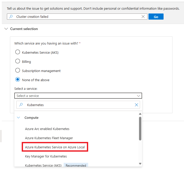 ドロップダウン リストから Azure Local の Azure Kubernetes Service を選択します。