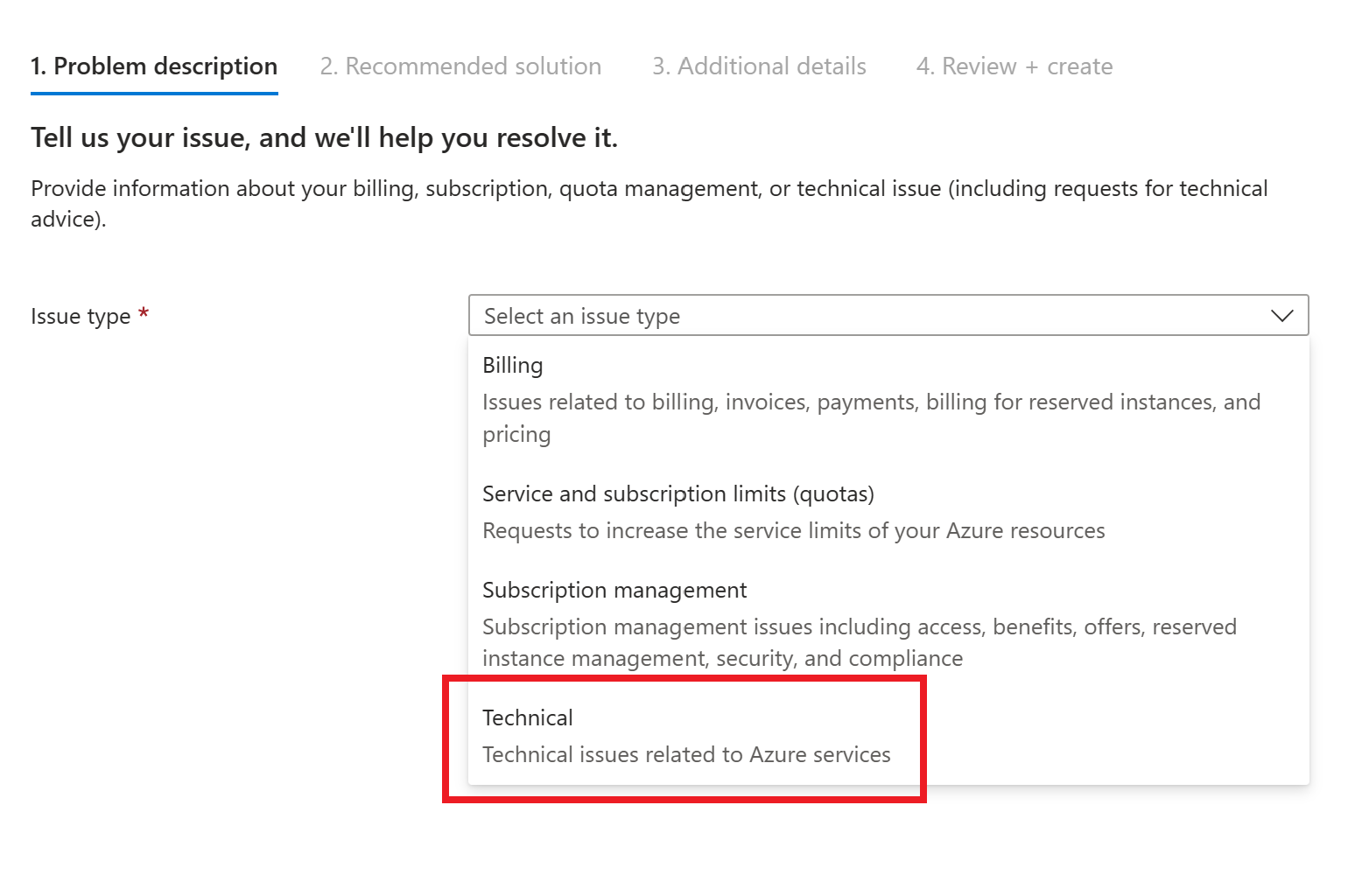 ドロップダウンから、 Technical 問題の種類を選択します。