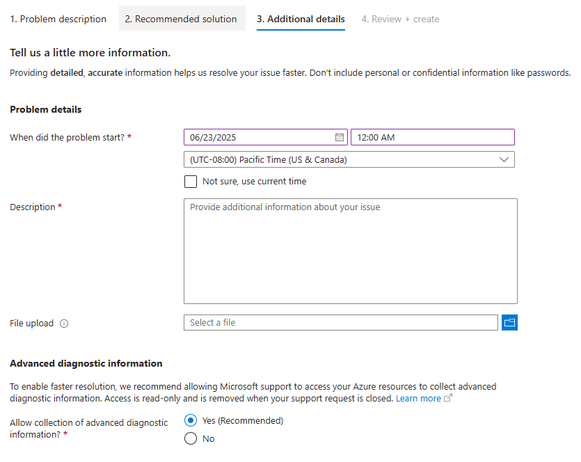 サービス名は、[ サービス ] フィールドに自動的に設定されます。 そうでない場合は、ドロップダウンから選択します。 [ 概要]、[ 問題の種類]、[ 問題のサブタイプ ] フィールドも、以前の選択内容に基づいて自動的に設定されます。 そうでない場合は、ドロップダウン メニューから適切な値を選択します。